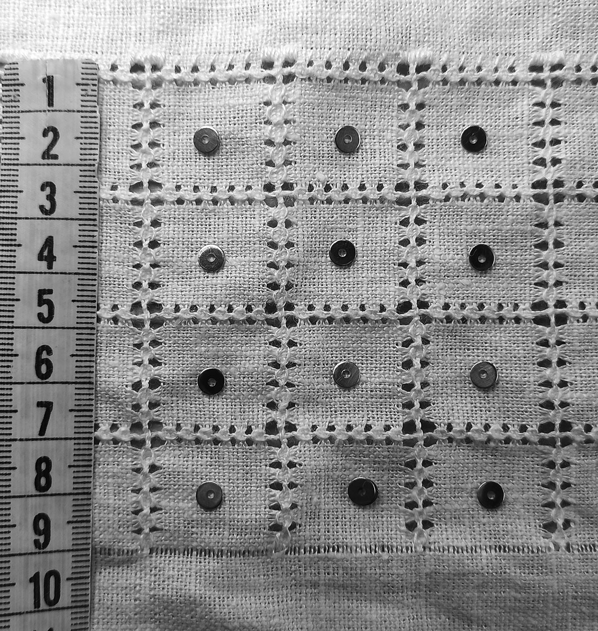 Ruudustiku tekitamiseks pidin tegema piluread ka teises suunas, siin jäi piluridade vahele 24 lõnga. Tekkis 2 × 2 cm ruudustik, tikandi kogulaius 9 cm.